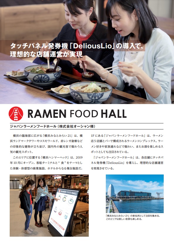 横浜の臨海部に広がる「横浜みなとみらい21」は、横浜ランドマークタワーや赤レンガ倉庫などのランドマークが立ち並ぶ、国内外の観光客で賑わう人気の観光スポット。このエリアに2019年10月にオープンした「横浜ハンマーヘッド」は、客船ターミナルと“ 食” をテーマとした体験・体感型の商業施設やホテルからなる複合施設です。1F にあるラーメン店5店舗とバーで構成されるラーメンコンプレックス「ジャパンラーメンフードホール」では、各店舗へのタッチパネル発券機「DeliousLio」導入によって、理想的な店舗運営と管理が実現しました。