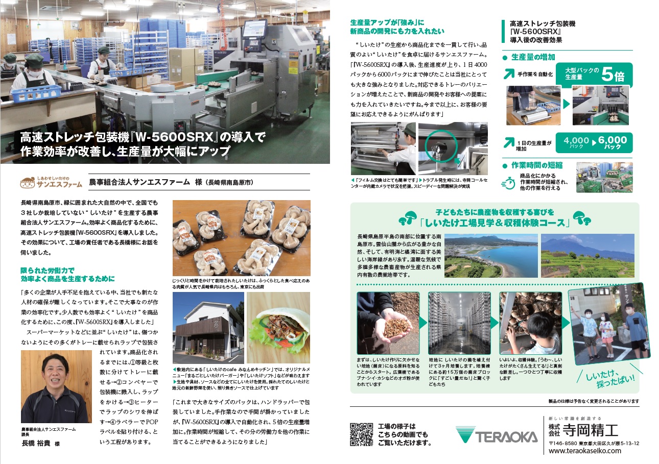 長崎県南島原市、緑に囲まれた大自然の中で、全国でも3社しか栽培していない“ しいたけ” を生産する農事組合法人サンエスファーム。限られた労働力で効率よく商品を生産するために、高速ストレッチ包装機『W-5600SRX』を導入しました。