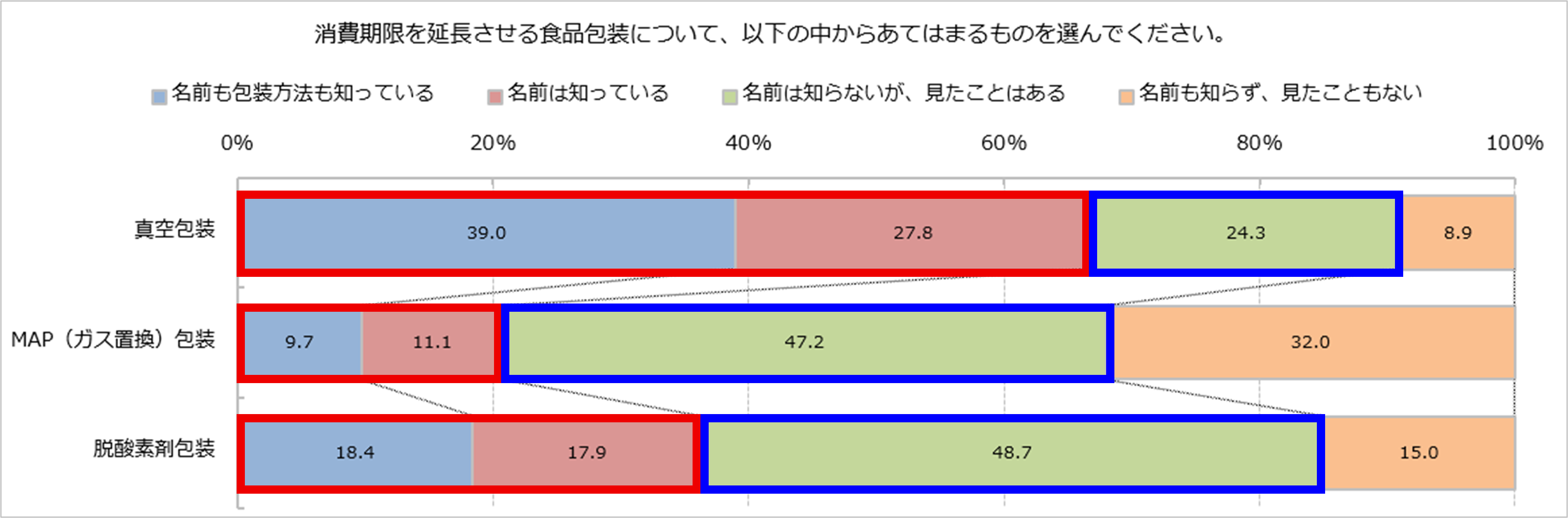 消費期限を延長する食品包装についての認知度を聞いたところ、「真空包装」は、「名前も包装方法も知っている」「名前は知っている」と答えた人が66.8%と、広く知られているのに対し、「MAP包装」は20.8%、「脱酸素剤包装」は36.3%と、認知は低いことが分かりました。ただ、「名前は知らないが、見たことはある」と答えた人は、「MAP包装」が47.2%、「脱酸素剤包装」が48.7%と半数近くに上りました。「MAP包装」「脱酸素剤包装」の名称や包装方法についての認知と理解は進んでいない一方で、実際には生活の中で目にしている人が半数近くいることがうかがえます。