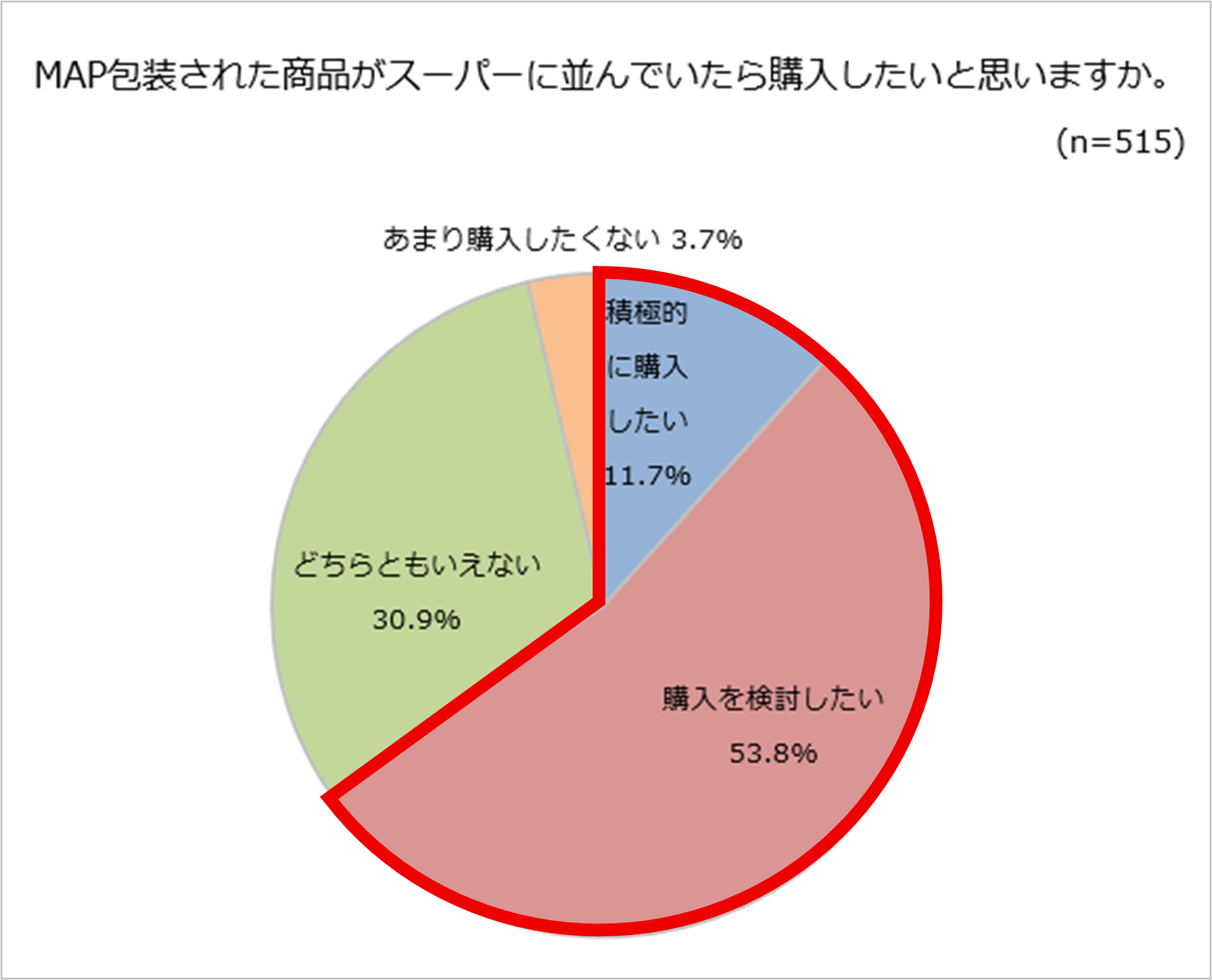 「MAP包装」について説明すると、「鮮度が保てる」(63.9%)、「消費期限が長くなる」(57.7%)、「食品ロスの削減につながる」(36.9%)など、生活に直結する実用的なメリットを感じる人が多いことが分かりました。さらに、スーパーマーケットに「MAP包装」された商品が並んでいたら「積極的に購入したい」「購入を検討したい」と答えた人は65.5%に達しており、現代人のニーズに合った包装であることが明らかになりました。