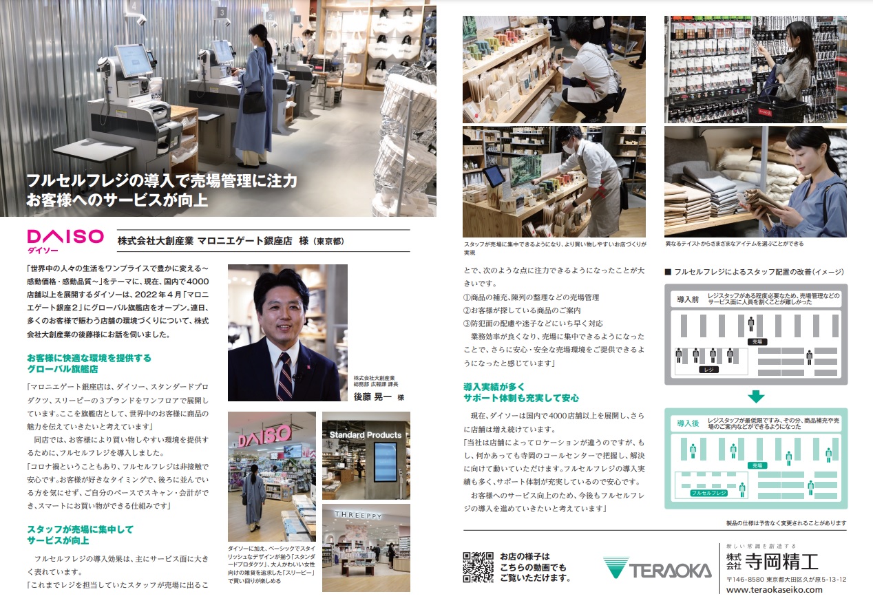 「世界中の人々の生活をワンプライスで豊かに変える~感動価格・感動品質~」をテーマに、現在、国内で4,000店舗以上を展開するダイソーは、2022年4月「マロニエゲート銀座2」にグローバル旗艦店をオープン。同店では、お客様により買い物しやすい環境を提供するために、フルセルフレジを導入しました。