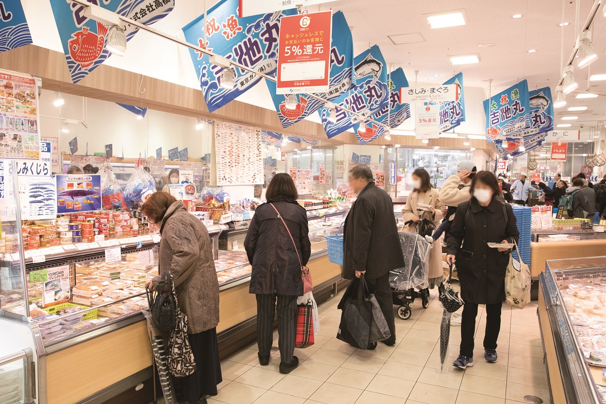 JR御徒町駅前で鮮魚小売店を営む吉池様では、2014年のリニューアルオープン後、レジにできる行列をなんとかしなければと模索されていました。レジにできる行列を解消し、お客様に楽しく快適なお買い物を提供するため、2014年にTERAOKAのスピードセルフ、2018年にPayossを導入されました。