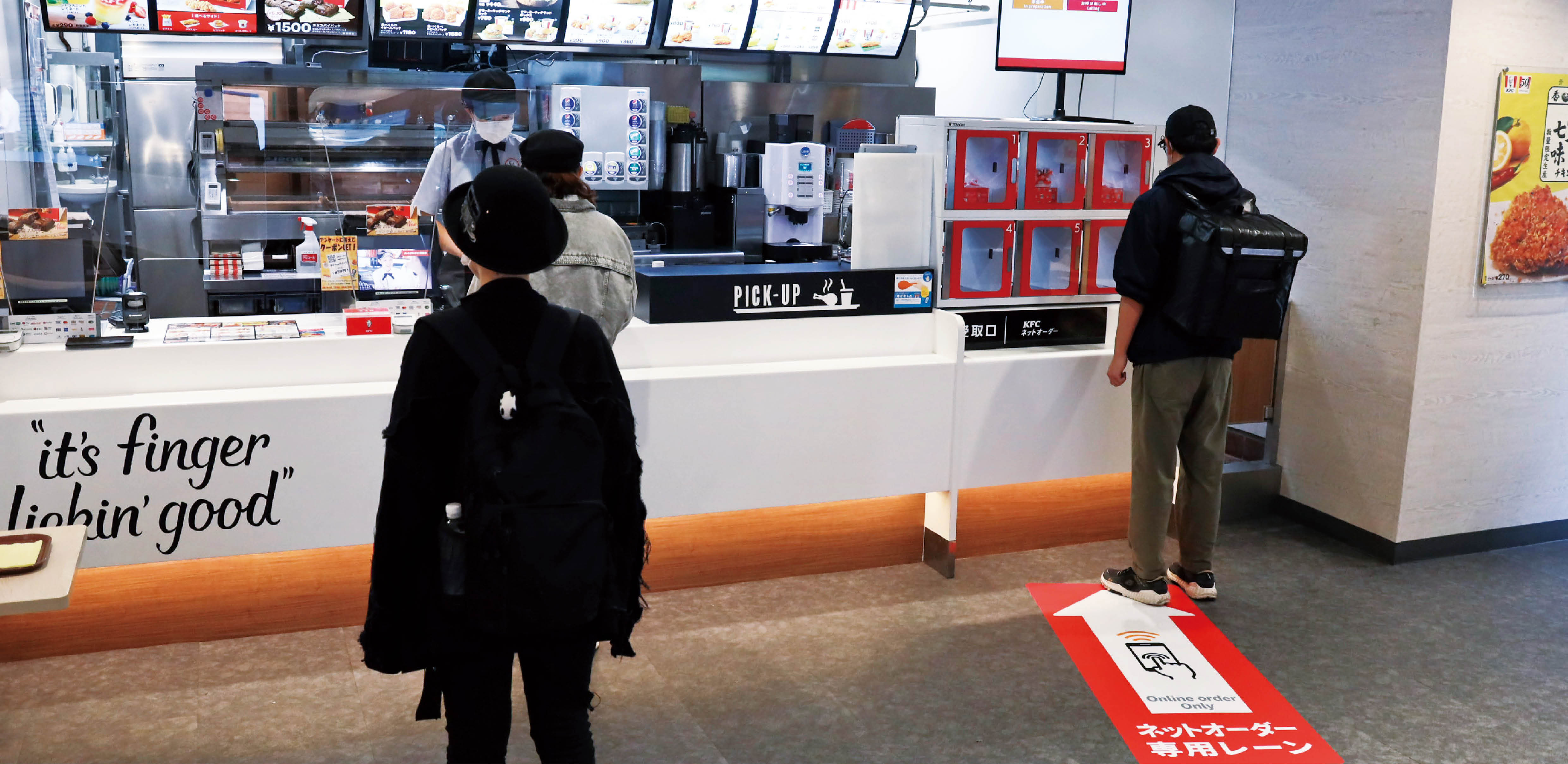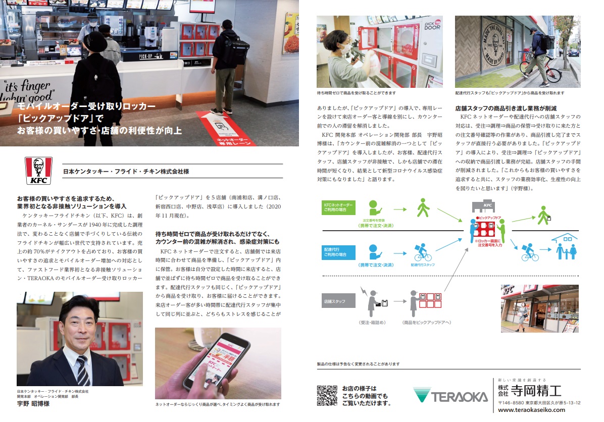 ケンタッキーフライドチキン (以下、KFC) は、売上の約70%がテイクアウトを占めており、お客様の買いやすさの追求とモバイルオーダー増加への対応として、ファストフード業界初となる非接触ソリューション・TERAOKAのモバイルオーダー受け取りロッカー「ピックアップドア」を導入しました。 (南浦和店、溝ノ口店、新宿西口店、中野店、浅草店 / 2020年11月現在)
