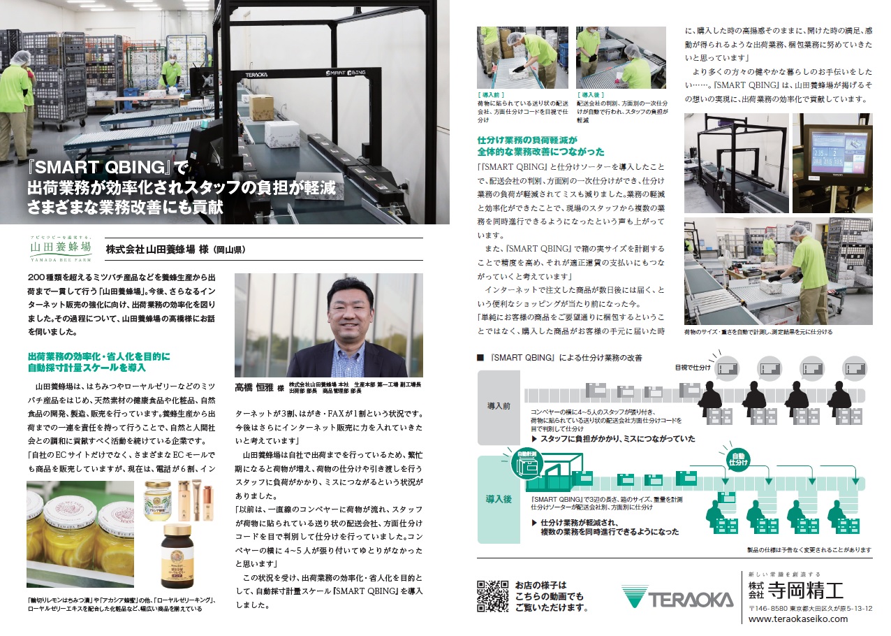 山田養蜂場は、はちみつやローヤルゼリーなどのミツバチ産品をはじめ、天然素材の健康食品や化粧品、自然食品の開発、製造、販売を行っています。養蜂生産から出荷までの一連を責任を持って行うことで、自然と人間社会との調和に貢献すべく活動を続けている企業です。この度、出荷業務の効率化・省人化を目的として、自動採寸計量スケール『SMART QBING』を導入しました。