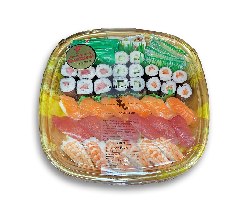 RGW-560Ⅱを活用する事で、Allseas Sushiではしっかりとした包装と詳細な商品情報を表示したうえで、中身がはっきりと見える美しいパッケージが実現しています。