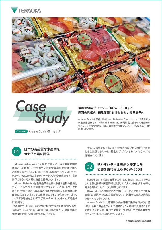 Allseas Sushiを運営するAllseas Fisheries Corp.は、カナダ最大級の水産流通企業です。Allseas Sushiは、寿司製品に見やすく魅力的なラベリングを行うために、DIGIの帯巻き包装プリンター『RGW-560Ⅱ』を利用しています。