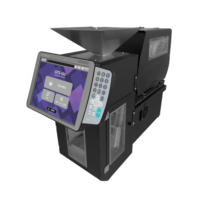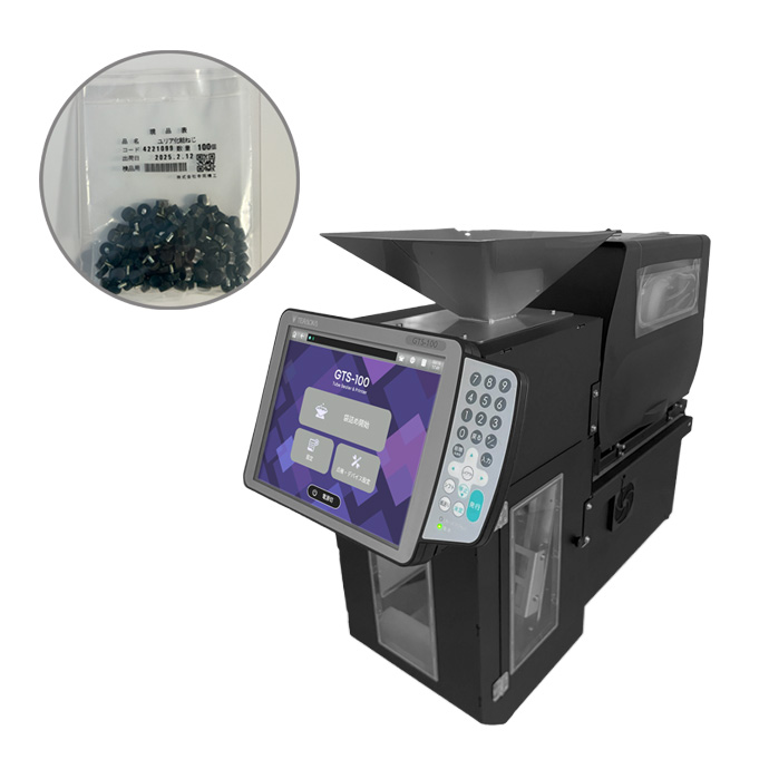 袋詰め包装機「GTS-100」は、部品を投入するだけで、袋詰め・袋の溶着、袋への現品票印字を自動で行います。