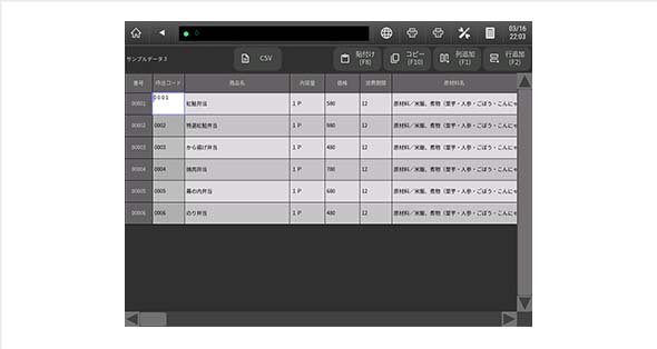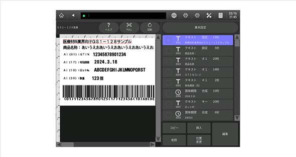 - あらかじめ印字項目に対しロットナンバー・内容量・日付などの必要条件を設定しておけば、入力内容の誤りを画面・音声メッセージで知らせる、ラベル発行ミス防止機能を搭載。
