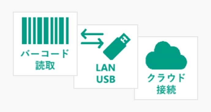 バーコードと計測実績をLAN経由でPCに送信。LAN環境が無くてもUSBメモリーに実績を保存することも可能。 -