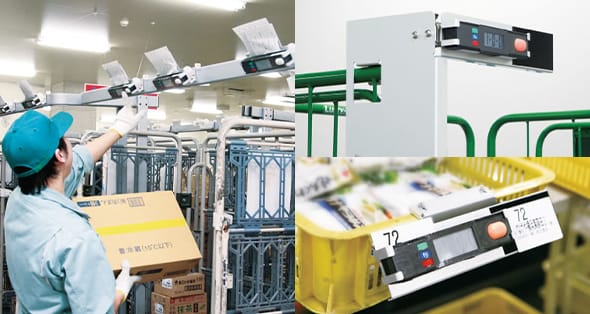 PLT-1030(3連ハイコントラストLCD)、PLT-1010(1連ハイコントラストLCD)、PLT-1000(1連電⼦ペーパータイプ)を⽤意。作業環境に合わせて選択できます。特にPLT-1030の使⽤により、3アイテム同時仕分け、多品種少量品の対応や追い越し作業が可能となり、作業効率が⼤幅に向上します。