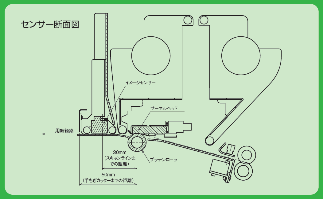 イメージセンサーはサーマルヘッドと手もぎカッターの間にあります。印字された後すぐにラベルを判定できるのはこのためです。イメージセンサーをプリンターの内部に格納したことで、設置スペースも従来のプリンターと変わりません。