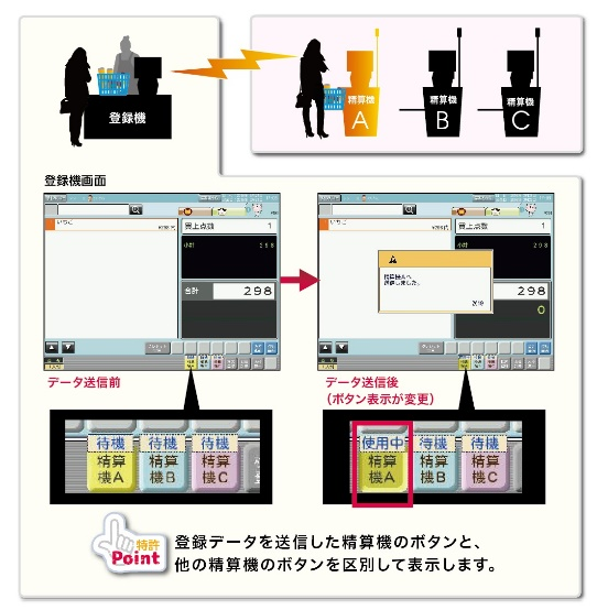 具体的には、登録装置でバーコードを発行し買物客が任意の精算装置で読取る従来の方式に代え、登録装置の画面上に精算装置を示すボタンを表示させ、当該ボタンを押すと当該ボタンに対応する精算装置で買物客が精算処理を行えるように取引データを送信するようにしました。そして、送信した (=使用中の) 精算装置のボタンと、そうではない (=空き状態・待機中の) 精算装置のボタンとが区別可能なように、異なる態様で表示されるようにしました。