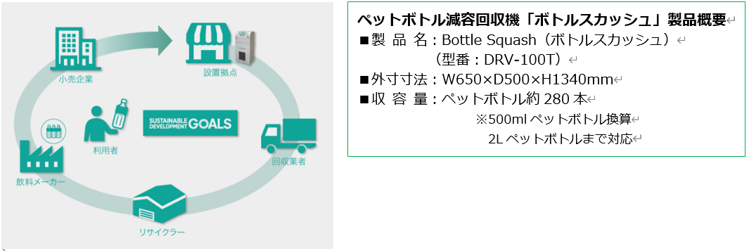 ▲ペットボトル減容回収機「Bottle Squash (ボトルスカッシュ DRV-100T)」
