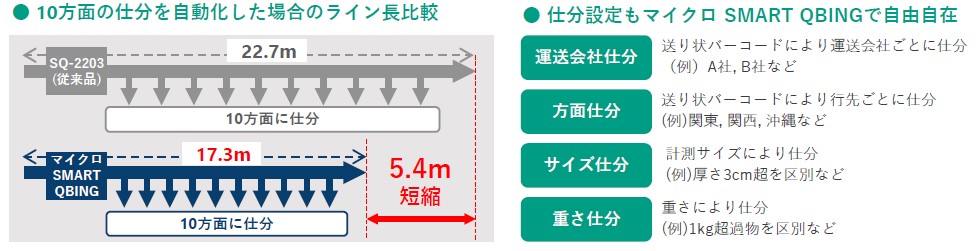 自動仕分け機「コンパクトソーター」との接続で、測定結果やバーコード情報を基に効率的な自動仕分けが可能となり、出荷作業を大幅に効率化します。これまで設置できなかったような場所にも設置可能で、後からの増設も容易なため、荷物量に合わせて設備規模を増強できます。仕分けパターンは「マイクロSMART QBING」の操作モニターで自由に設定可能。荷物の種類が増えても仕分けパターンを瞬時に変更できます。