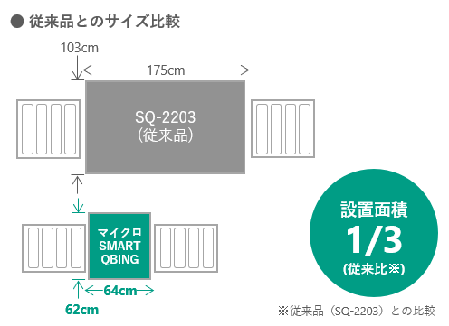 「マイクロSMART QBING」は本体サイズ長さ64cm×幅62cmと、標準モデルと比較し大幅にコンパクト化。設置面積は標準モデルの1/3となり、設置場所を選ばずスペースの限られた倉庫でも使用できます。また100Vの家庭用電源で動作するため、導入も容易に。荷量に応じて移設を考えている荷主様にも最適です。