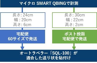 「マイクロSMART QBING」での計測データーとバーコードは紐づけされ、クラウドサービス「SQ CLOUD」との連携によって、計測サイズに合わせて最適な宅配サービスの自動選択が可能となります。さらに自動ラベル貼付機「オートラベラー」と連携させると、適合した宅配サービスの送り状印刷・荷物への貼付けまで自動で行います。