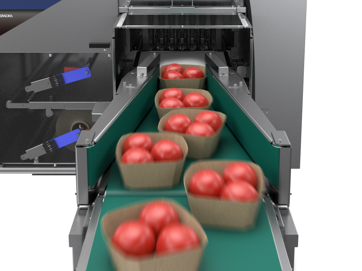 本製品はコンベア上で検知したトレーサイズに合わせて、2本掛けした異なるサイズのフィルムを自動で切り替え、多様なサイズの商品・トレーに対応します。後続に自動貼りラベラー、ラベル検査装置、異物検出器などを接続し、1本の包装ラインで少量多品種の商品包装に柔軟に対応できます。従来の大型包装機がオーバースペックである中・小規模工場(プロセスセンターや青果工場など)や、大規模食品工場のサブライン機としても最適です。