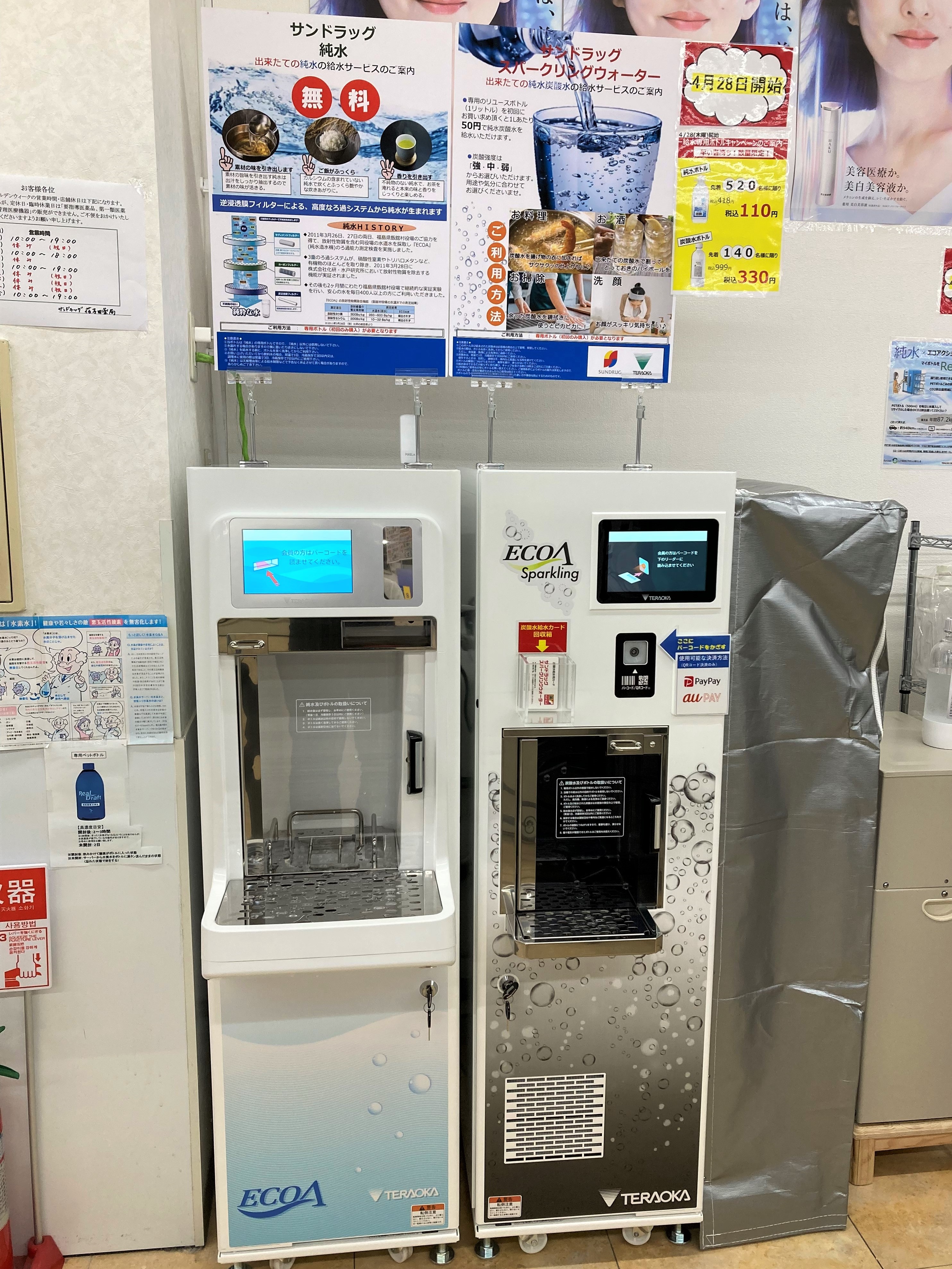 医薬品や化粧品はもちろん、生活雑貨、食料品にいたるまで豊富な商品を揃え、多様化するニーズに柔軟に対応し、より便利な店舗作りを行っているサンドラッグでは、純水の炭酸水を給水できる、純水炭酸水自動販売機「ECOA Sparkling」および純水自動販売機「ECOA」を「サンドラッグ 荏子田店」へ導入し、4月28日(木)より稼働を開始しました。ドラッグストア店頭での純水炭酸水給水サービスの提供は、日本初※となります。