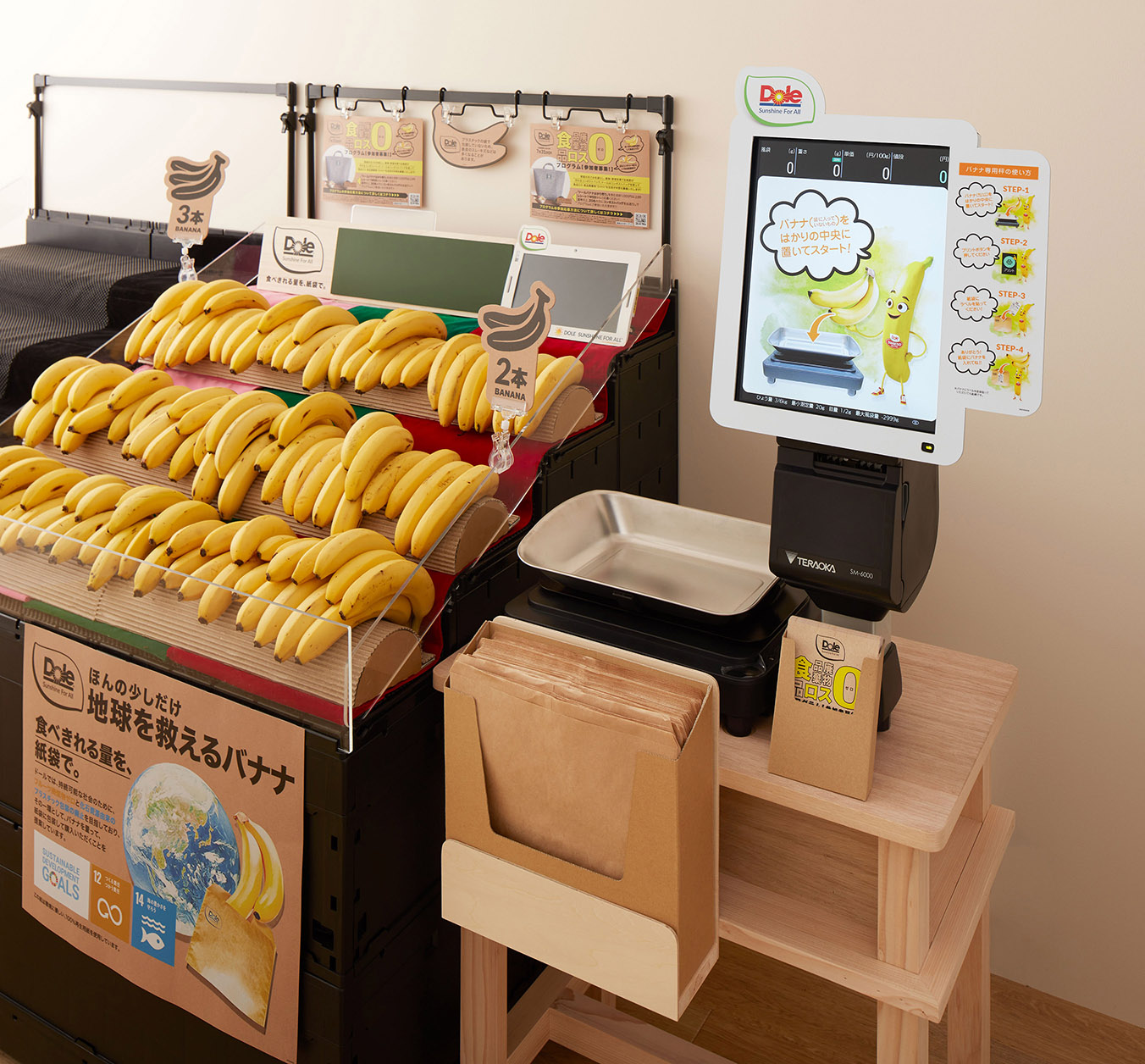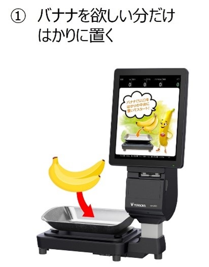 当社は、日本初の商業用バネ秤を開発した“はかりのパイオニア”として、量り売りの日常化を進めるべく、お客様がスムーズにセルフで量り売りの買い物ができるよう最新のテクノロジーを駆使した関連製品を開発、導入を進めています。この度、ドールの『バナナエシカルバリューチェーンプログラム』における「バナナの量り売り企画」を実現するために、当社製セルフサービススケール「SM-6000SSR」を導入いたしました。