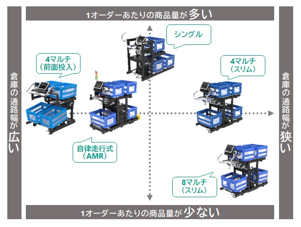 1オーダー分の大量アイテムを処理する「シングル」、8オーダーまでを1回で処理する「8マルチ」、1オーダーも複数オーダーもバランス良く処理する「4マルチ」タイプなど、業種や品物、センター規模、作業者などの条件に応じて最適なモデルを選択できる豊富なバリエーションを取り揃えます。