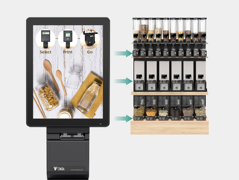 DIGIは、バルクショッピング体験から容器の風袋引きやPLU検索などの手間を取り除く、ゼロ・ウェイストの小売ソリューション「All-in-One Bulk」システムを開発しました。このシステムにより、環境に配慮した買い物客は、再利用可能な容器を使用して、以前よりも簡単に無駄なく商品を購入できるようになります。このシステムの特長は、商品や容器を個別に計量する必要をなくすためにスケール技術が組み込まれていることです。
