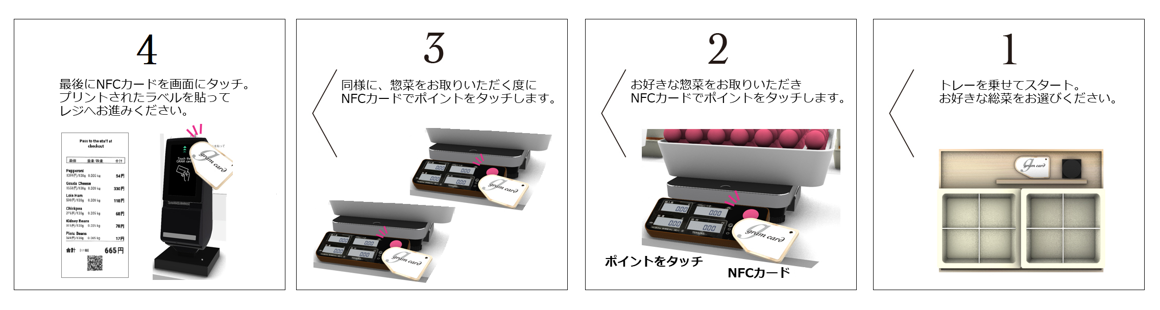 お買い物時は、お客様が商品を取ると同時に減算式はかり「SBS-1000NFC」が計量した商品の重さ・価格を算出します。そしてお客様がNFCカードを秤本体にかざすと、それらの購入情報とカードIDがプリンターコンソールに記録されます。次の商品を計量する時も同じ手順を繰り返し、精算用ラベルは最後にまとめて発行、レジにて会計をしていただくという簡単操作です。