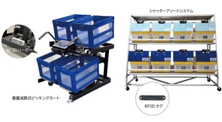 「重量減算式ピッキングカート」と「シャッターアソートシステム」をRFIDで連携する「重量検品アソートシステム」を展示します。商品を積載したカートがシャッターアソートシステムに近づくと、RFIDを介して商品関連情報を連携し、商品を投入する間口のシャッターが自動で開きます。カートに表示された商品を指定数だけ間口に投入して完了ボタンを押せば仕分けが完了。