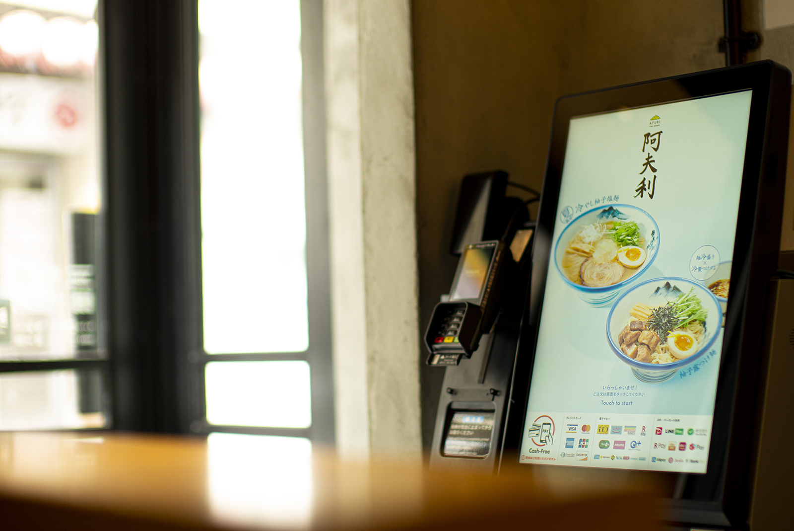 タッチパネル券売機「DeliousLio」は、横幅500mmのスリムな本体に業界初のタテ型タッチパネルを採用した、新感覚のセルフオーダー券売機です。高解像度の大画面は、「らーめんAFURI」のメニューをシズル感たっぷりに表現します。クラウドサービス「Delious」から画面をフリーレイアウトで自由に構成でき、音声ファイルをインストールすれば音声案内の差し替えも簡単。限定メニューのお勧めやイベントにも柔軟に対応し、視覚と聴覚に訴える効果的なプロモーションを後押しします。
