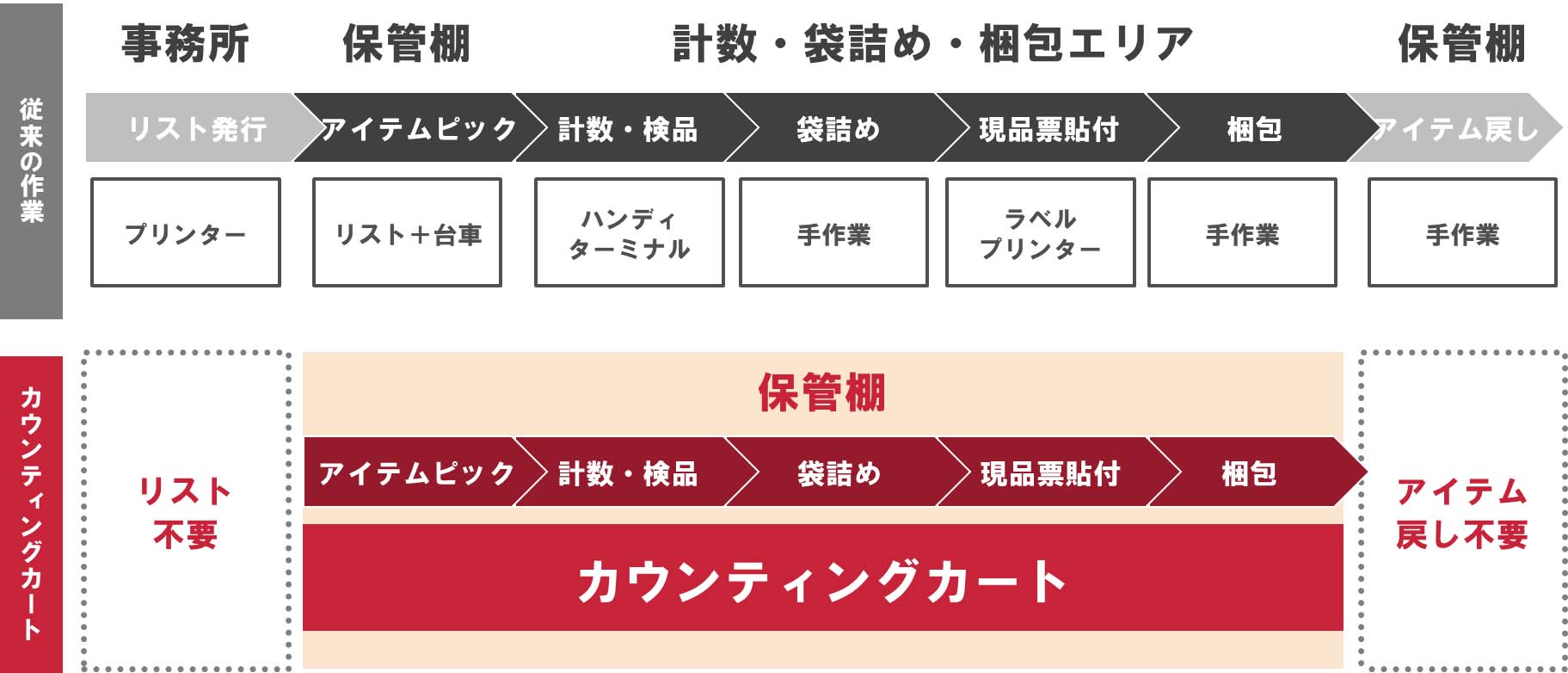 従来の倉庫作業では、事務所でのリスト発行、保管棚でのアイテムピック、梱包エリアでの計数・袋詰め・梱包作業など、工数がかかる上に工程ごとに作業場所の移動が必要でした。本製品にはピッキングから梱包までの作業をカート上で完結できる機能を備え、余計な移動を削減します。