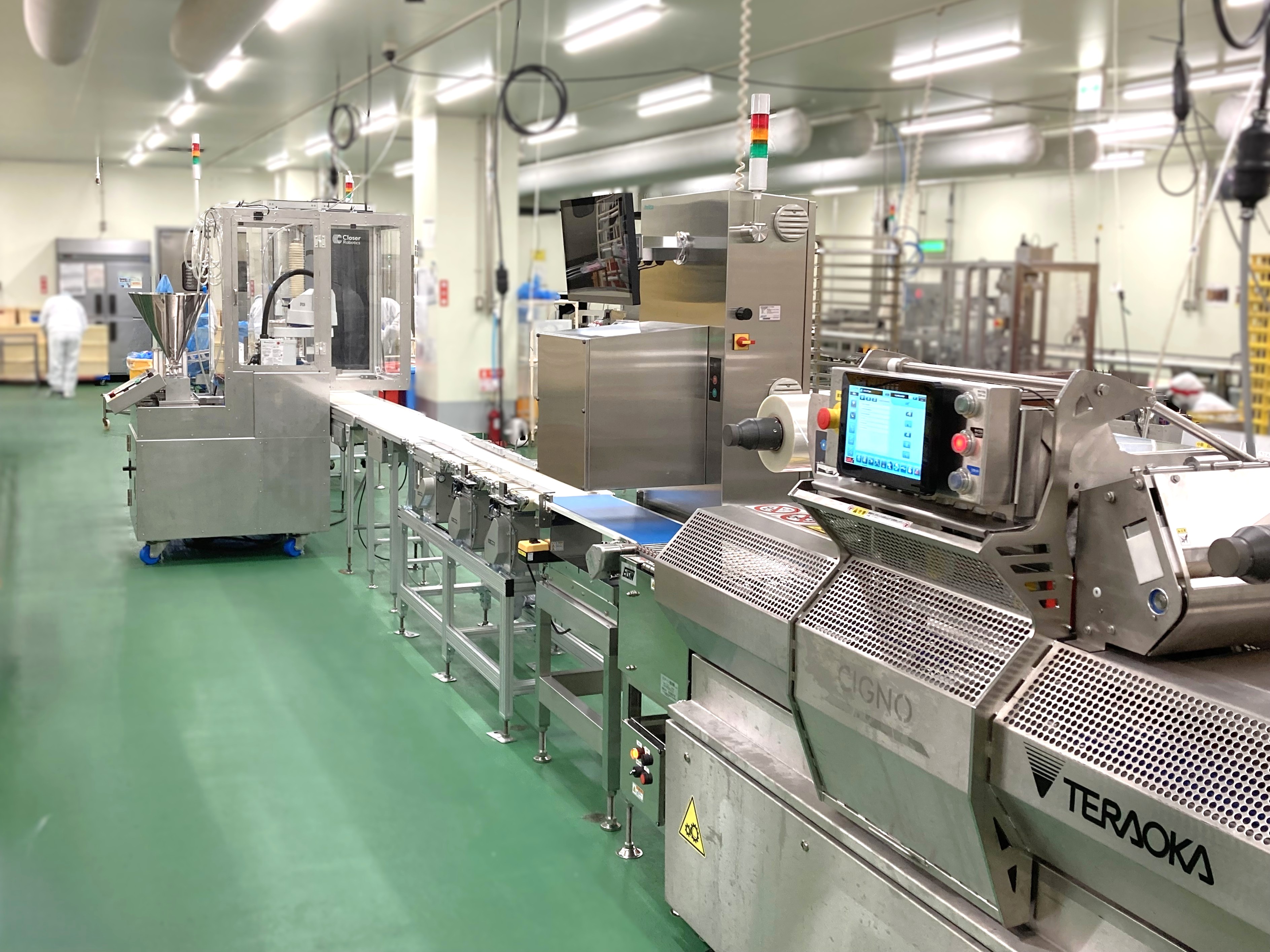麺惣菜の盛付工程におけるロボットフレンドリー※1な環境構築を目指す本プロジェクトでは、当社は小型ガス置換(MAP※2)トレーシーラー「CIGNO(チーニョ)」、自動値付機「HC-800」で包装・値付工程を担い、さらにベンダー企業を代表してライン全体のエンジニアリングを担いました。