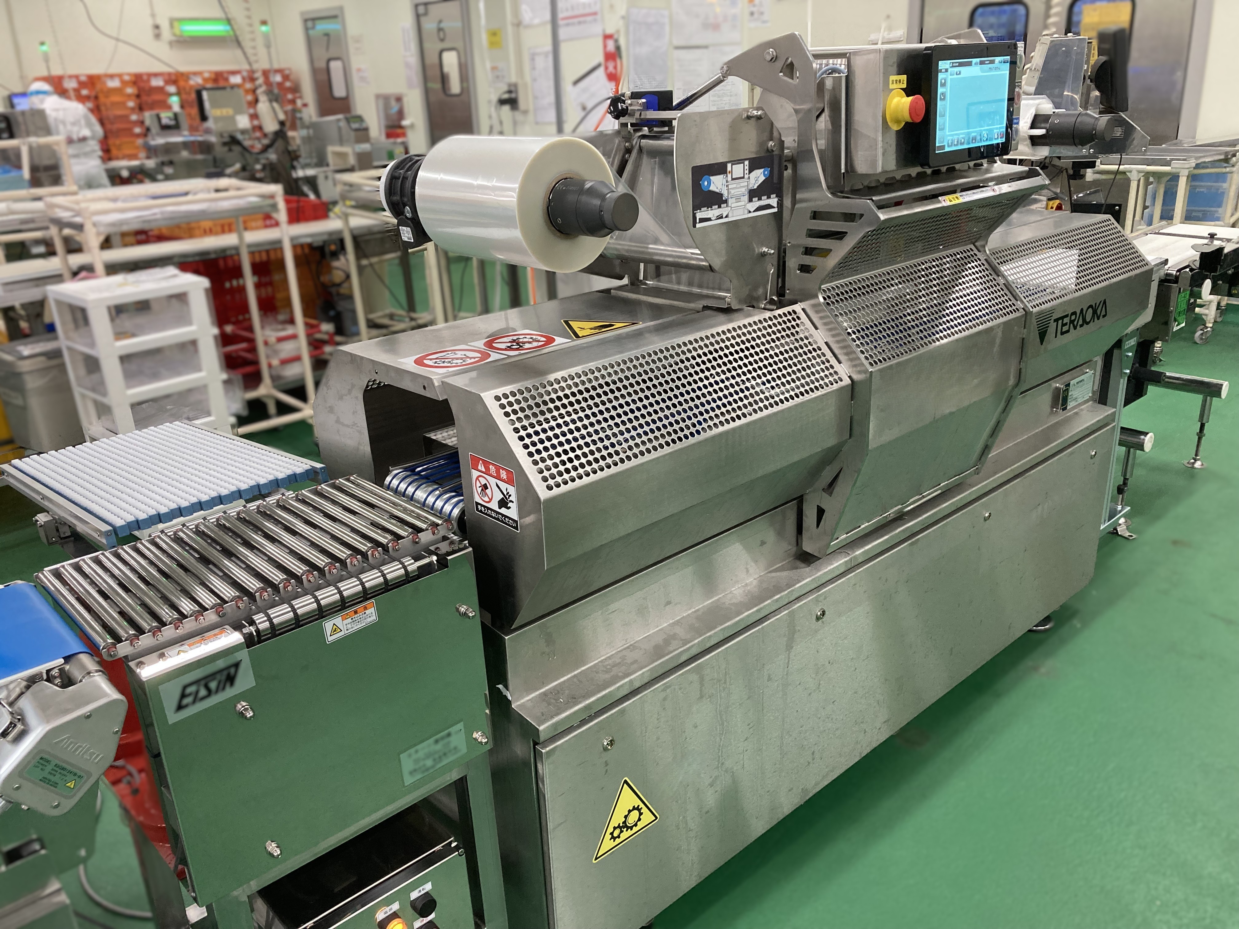 当社では、ガス置換トップシール※3包装を行う小型トレーシーラー「CIGNO」、後続のラベル印字・貼付けを行う自動値付機「HC-800」を導入しました。ガス置換により消費期限を延長し、さらにトップシールは上面が平面で凹凸がなく、吸着パッドでハンドリングができるため、容器移載のロボフレ化を実現しました。