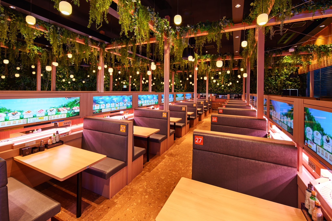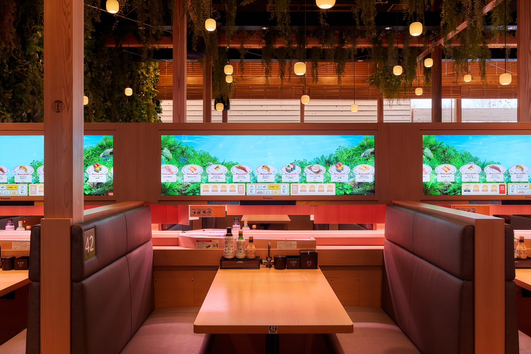 各席に設置されたディスプレイ上に回転レーンを再現し、流れるおすしの映像を見ながら直接タッチ操作で注文することができます。横長の大型ディスプレイとなっているため、複数人で画面を見ることができ、同時操作も可能です。2023年9月からスシローの一部店舗で先行導入を開始して以降、導入店舗を拡大しています。