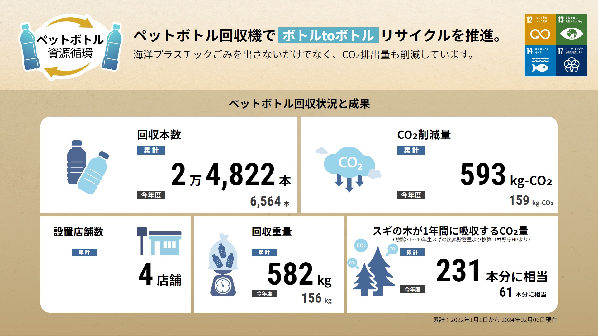 「ボトルスカッシュ」で実現したリサイクル数値を確認することができる「リサイクル見える化モニター」を取り付けることも可能です。モニターには、ペットボトルの回収量や、回収によって削減されたCO₂排出削減量が掲示されるほか、「ボトルtoボトル(水平リサイクル)」によって化石由来原料の使用量削減が図られ、二酸化炭素排出量の削減につながるという呼び掛けを行います。「リサイクル見える化モニター」の設置により、リサイクル効果を「見える化」し、リサイクルへの参加を促します。