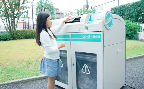 ペットボトル減容回収機「ボトルスカッシュ」は、スーパーマーケットなどの小売店や商業施設などでペットボトルを回収し、再びボトルや容器に生まれ変わらせ循環利用する「サーキュラーエコノミー」へ向けた“リサイクルの入り口”として2017年に誕生しました。