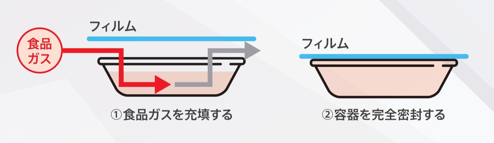 消費期限を延長する食品包装のひとつである「MAP包装(ガス置換包装)」は、食品トレー内の空気を窒素や二酸化炭素などの食品の保存に適したガスに置き換えることで、酸化や細菌の繁殖を抑え、食品の保存に最適な環境をつくり、鮮度を保ちながら消費期限を延長する技術です。欧米ではすでに普及しており、日本でも導入が広がりつつあります。