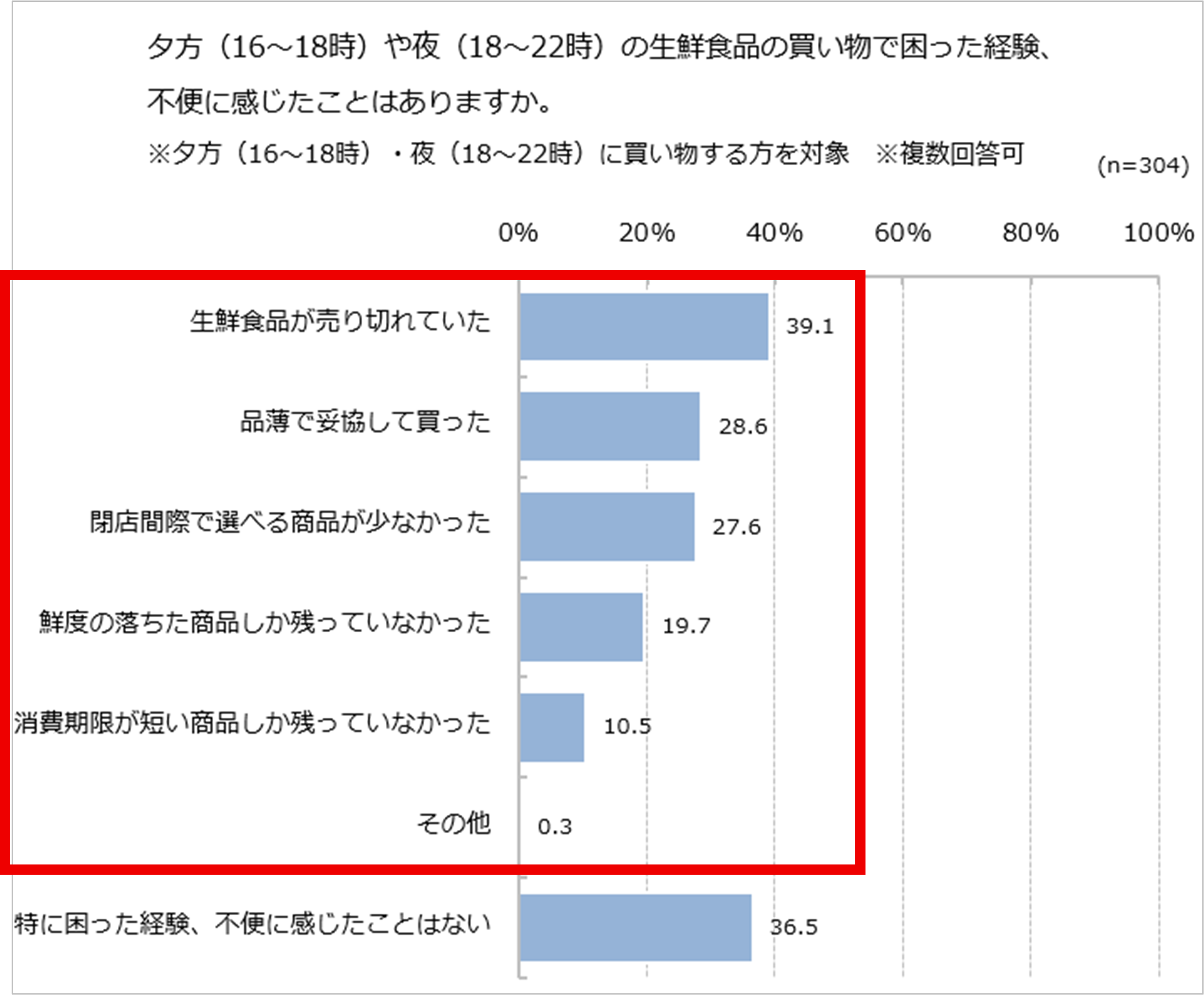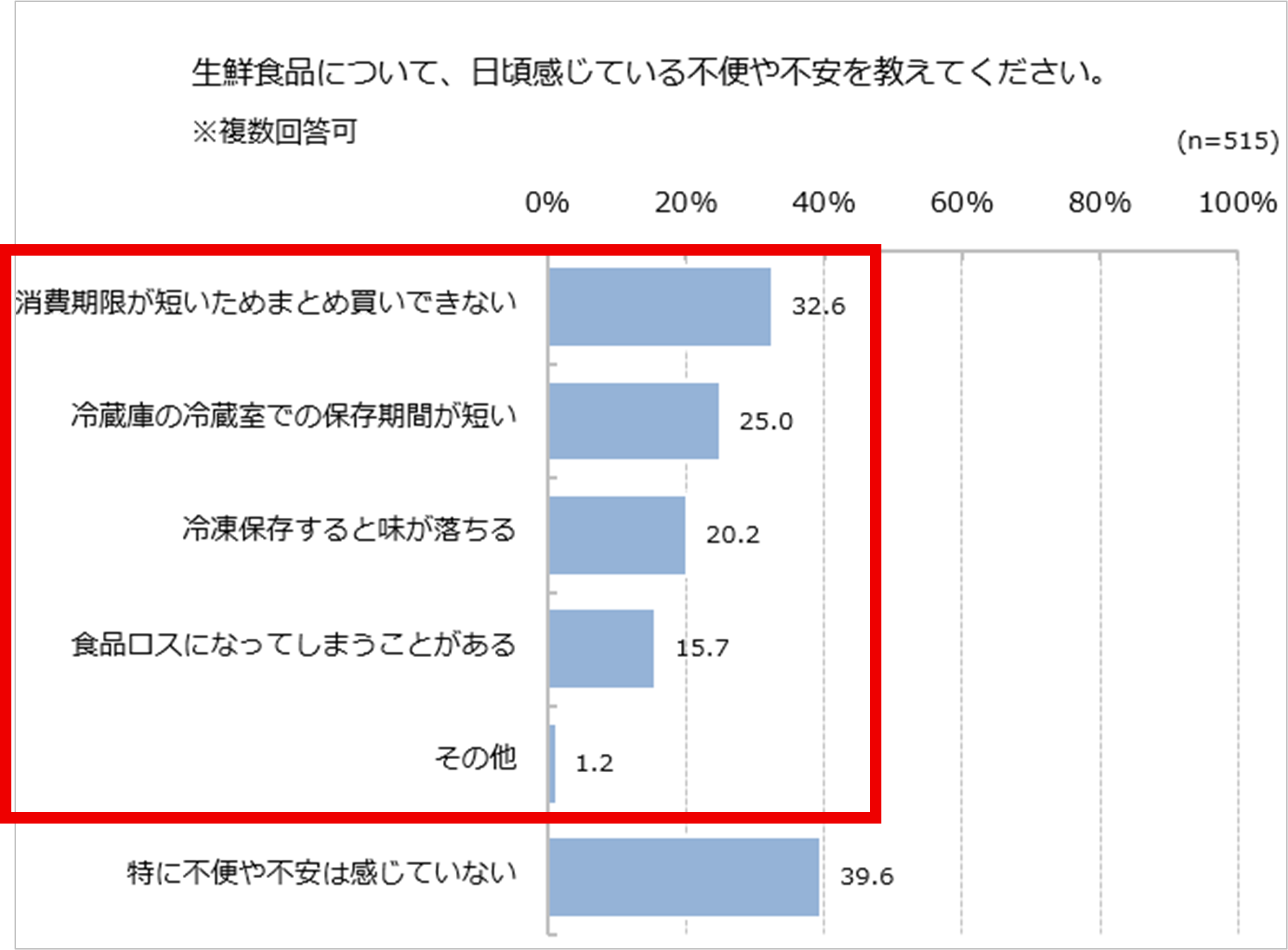 こうした買い物傾向の中、夕方以降の生鮮食品の買い物で、「特に困った経験、不便に感じたことはない」と回答した36.5%を除く、63.5%が困った経験や不便に感じたことがあると分かりました。そのうち、「生鮮食品が売り切れていた」経験がある人は39.1%、「生鮮食品が品薄で妥協して買ったことがある」人は28.6%に上り、夕方以降の生鮮食品の“品揃え”について困った経験が多いことがうかがえます。また、生鮮食品について、「特に不便や不安は感じていない」と回答した39.6%を除く、60.4%が不便や不安を抱えており、「消費期限が短いためまとめ買いできない」(32.6%)、「冷蔵庫での保存期間が短い」(25.0%)など、現代の買い物スタイルと商品特性のミスマッチが、消費者の悩みに繋がっている実態が明らかとなりました。