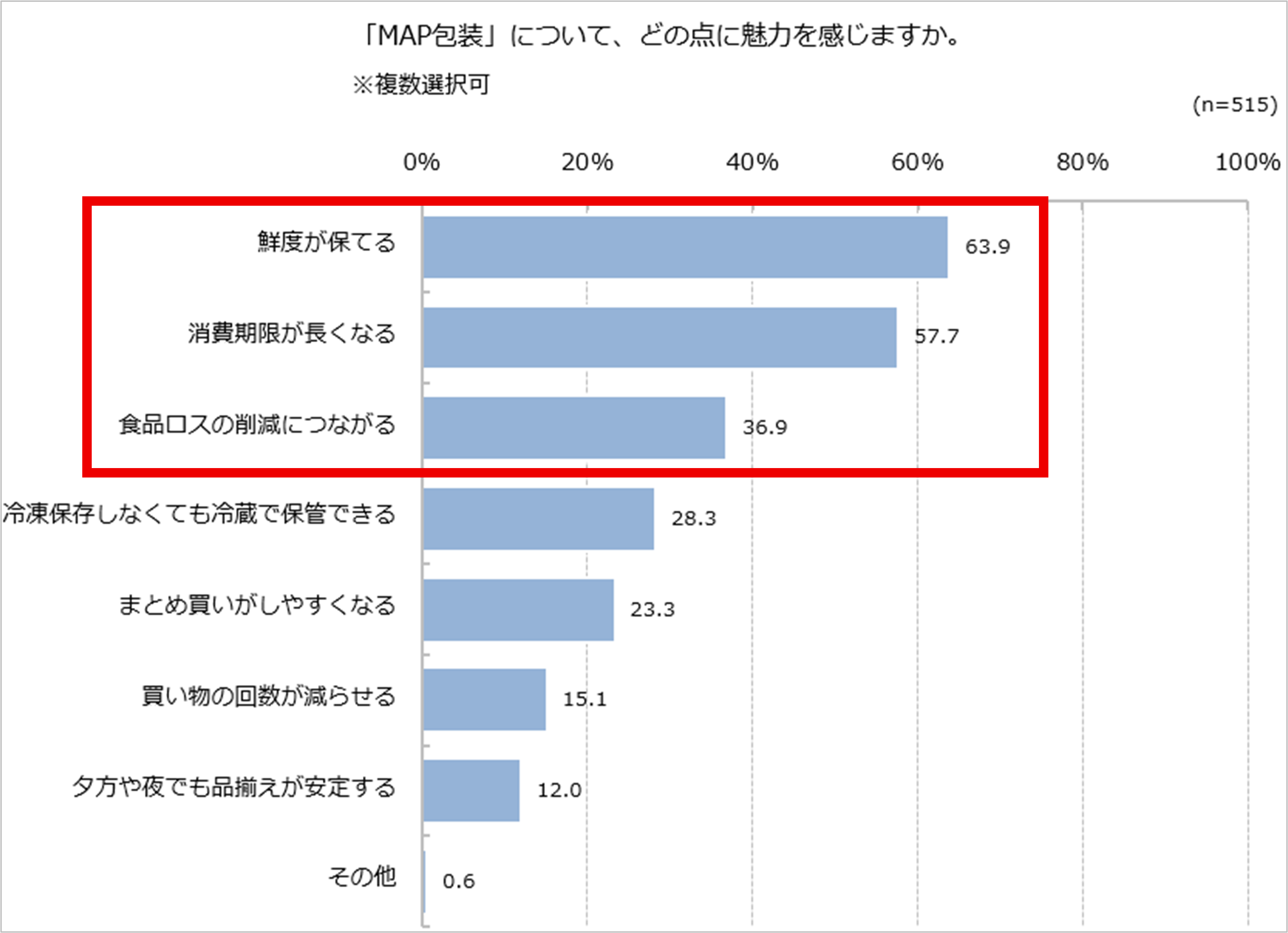 「MAP包装」について説明すると、「鮮度が保てる」(63.9%)、「消費期限が長くなる」(57.7%)、「食品ロスの削減につながる」(36.9%)など、生活に直結する実用的なメリットを感じる人が多いことが分かりました。さらに、スーパーマーケットに「MAP包装」された商品が並んでいたら「積極的に購入したい」「購入を検討したい」と答えた人は65.5%に達しており、現代人のニーズに合った包装であることが明らかになりました。