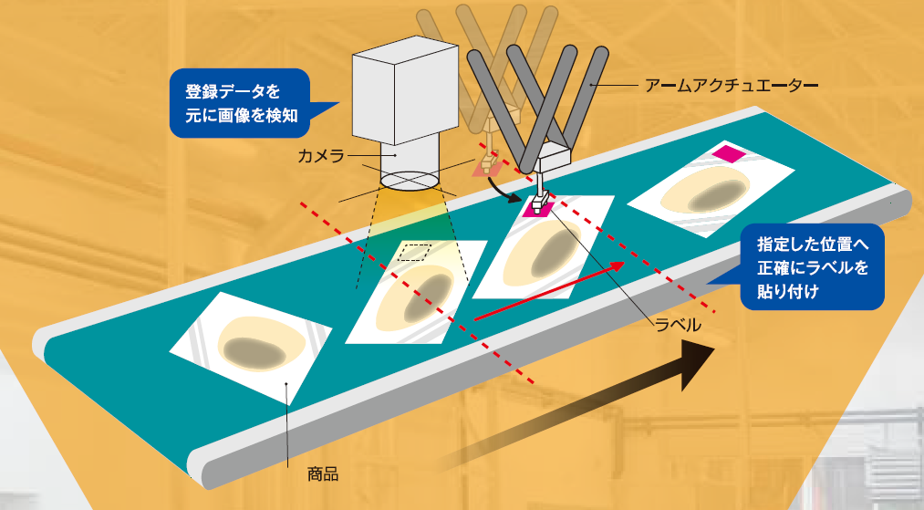 商品捕捉型自動ラベラー「ビジョンラベラー(HC-800VL)」は、コンベヤー上を向きが不揃いに流れるパッケージをカメラで認識し、その位置や進入角度を捕捉。捕捉した座標情報をもとに、電動アクチュエーターを用いた独自開発の貼付機構が正確なラベリングを行います。