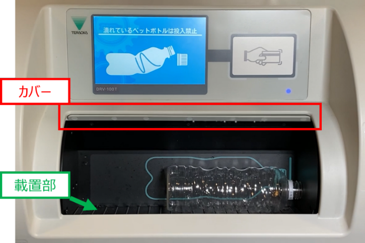 本発明は、ペットボトル減容回収機「ボトルスカッシュ®」における、ペットボトル投入口の横入れ構造に関するものです。ユーザーがペットボトルを横向きに投入する構造とし、外扉(カバー)が開いた状態(外扉が本体内に収納された状態)において、外扉前端部よりも手前にペットボトルを置く載置部を設けるようにしました。空のペットボトルを検知すると外扉が閉まり、内扉はペットボトルが減容部(コンパクター)に落下するように回動します。これにより筐体の飛躍的な小型化に成功しつつ、ユーザーがペットボトルの投入を容易に行うことができるようになりました。