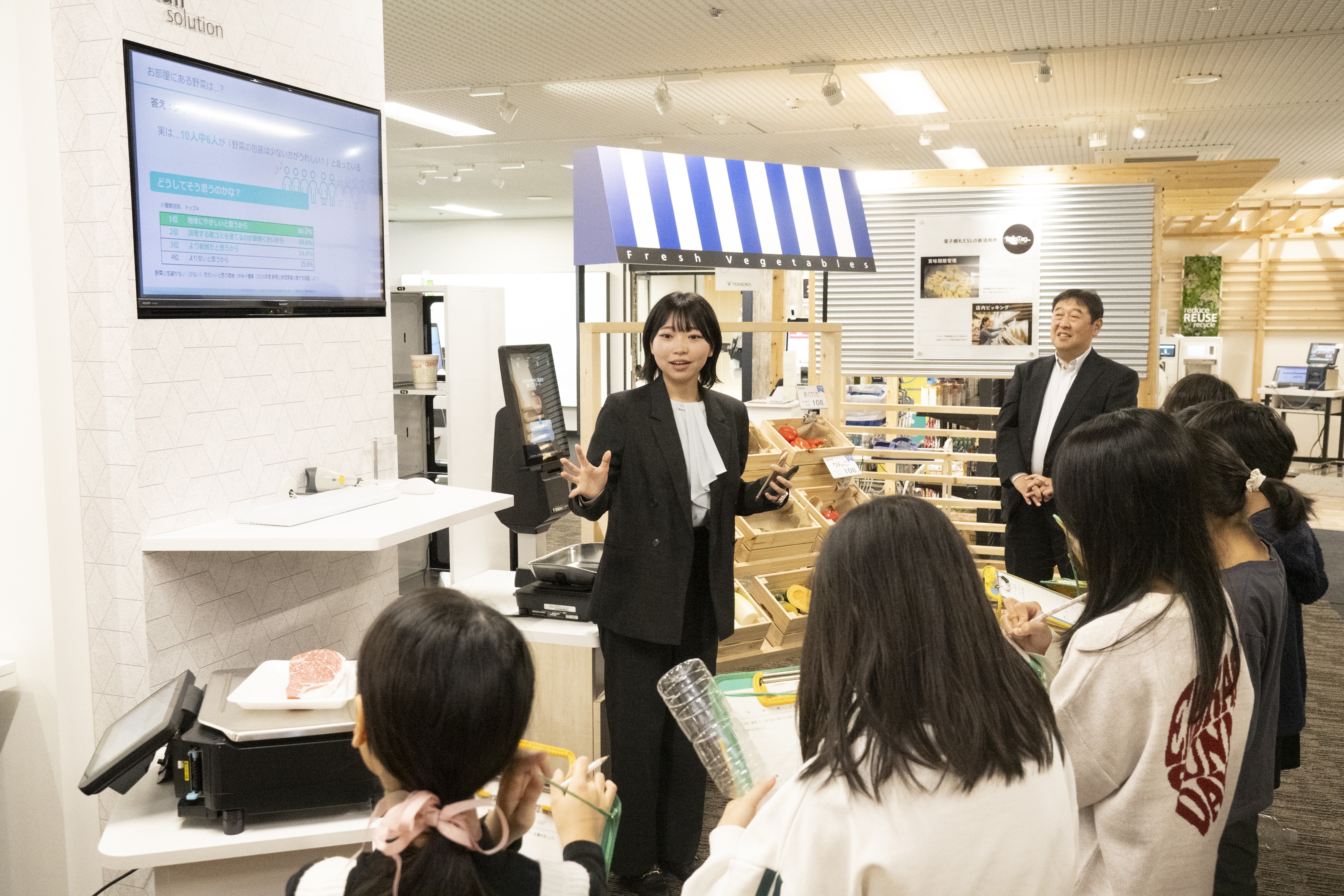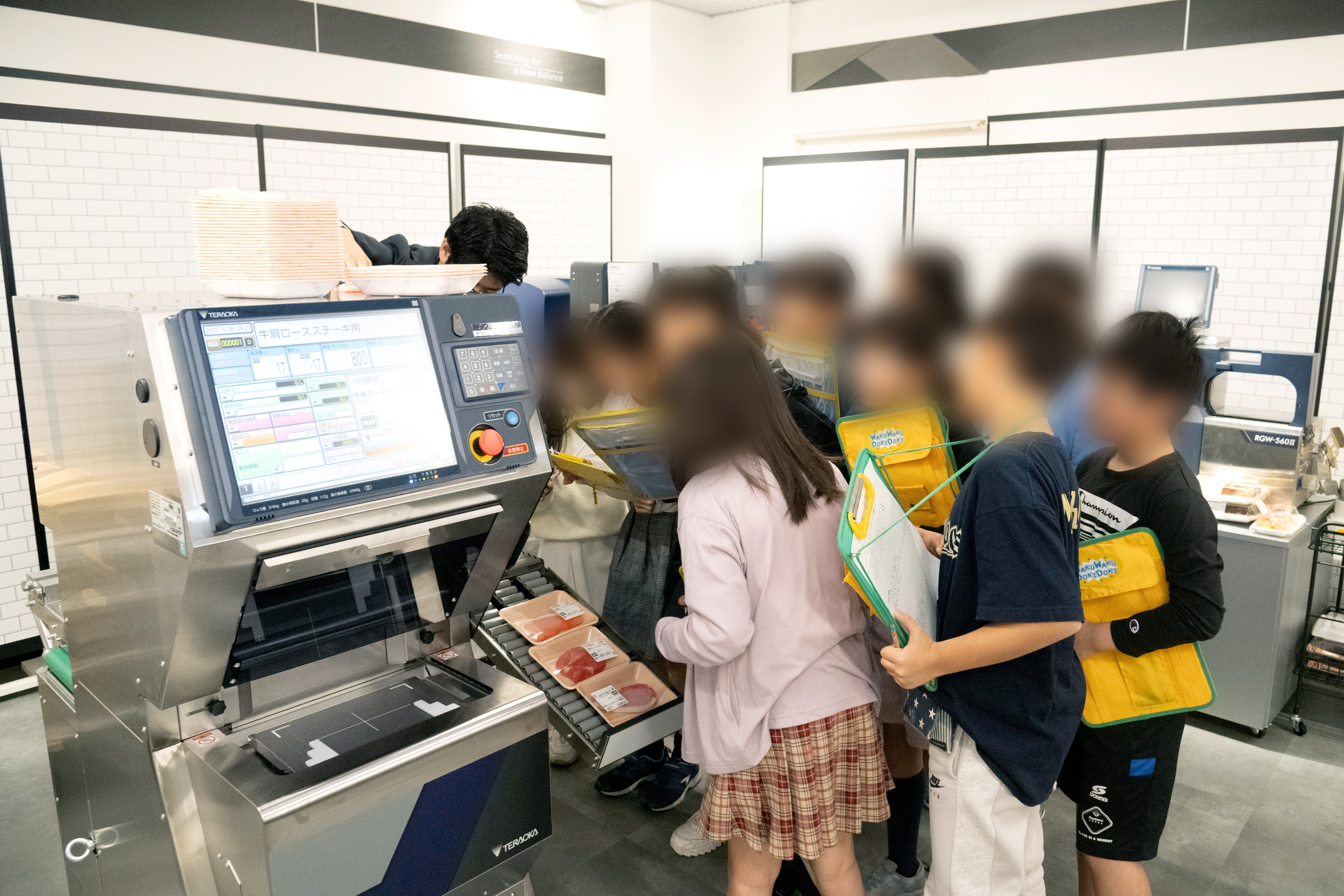 児童のみなさんがトレーを置き、計量・MAP包装・値付が自動で行われる様子を体験しました。