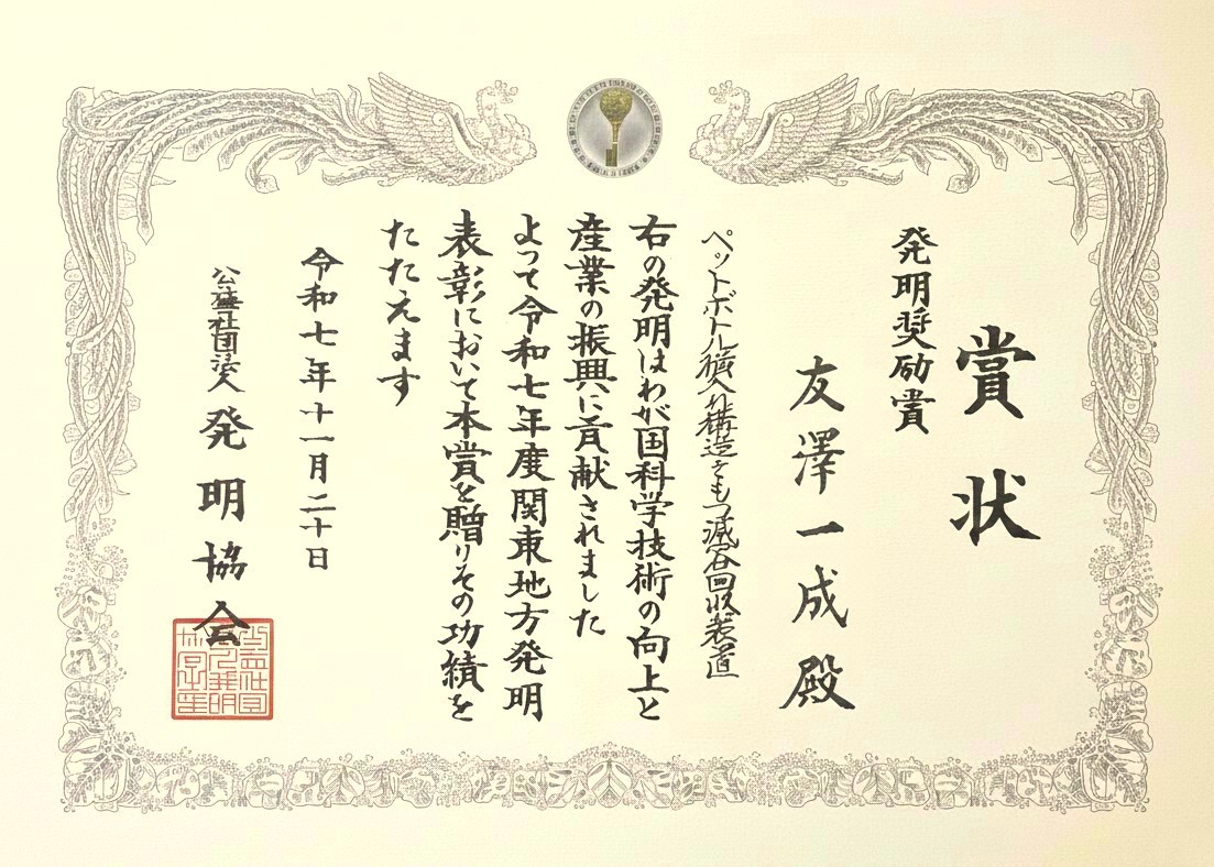 ニュース:ペットボトル減容回収機「ボトルスカッシュ」の発明が、令和7年度関東地方発明表彰「発明奨励賞」を受賞(2025/11/07)