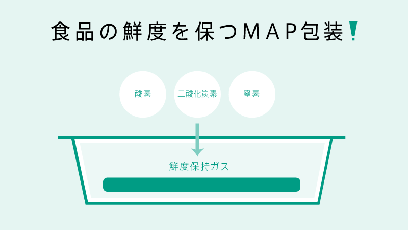 MAP(Modified Atmosphere Packaging:ガス置換包装)は、食品トレー内の空気を酸素・二酸化炭素・窒素などの食品の保存に適したガスに置き換える包装技術です。これにより、食品の酸化や菌の増殖を抑え、鮮度を長持ちさせます。